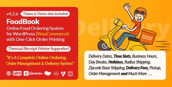 FoodBook é um sistema de pedidos e entrega de alimentos online para WordPress com opção de impressão de pedidos fácil e com um clique. Suporta impressora térmica/recibo. É um sistema completo de gerenciamento e entrega de pedidos online. É um sistema de filial única. Se você tiver Multibranch, compre o complemento FoodBook Multibranch com FoodBook. É um plug-in individual do WordPress para pedidos de alimentos online baseado em WooCommerce que permite adicionar facilmente o sistema de pedidos de alimentos ao seu site WordPress. Você pode receber facilmente pedidos de coleta e entrega ou apenas entrega ou apenas coleta usando o FoodBook.