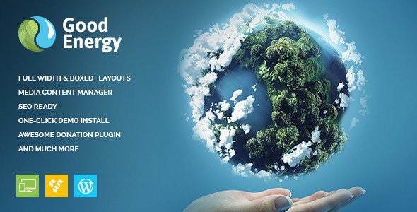 GOOD Energy – tema WordPress de ecologia multifuncional fresco e elegante . Ele é projetado para qualquer negócio relacionado ao meio ambiente (bem como organização ecológica sem fins lucrativos ). Também se adapta a qualquer empresa de reciclagem , empresa de distribuição de fontes alternativas de energia , agência de preservação ambiental , agência de arrecadação de fundos, sites de empresas relacionadas a orgânicos e biologia, pesquisa científica ou campanhas sociais, etc.